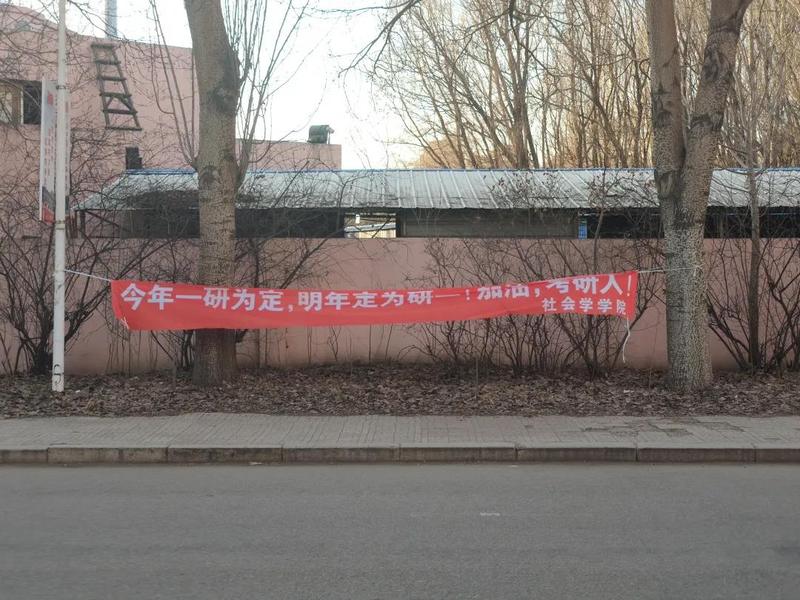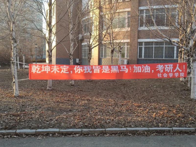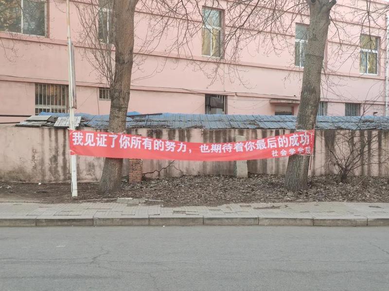 研研冬日,温情相伴。12月24日晚,同学们不畏严寒在校园里拉起条幅为考研学子添动力、送温暖。