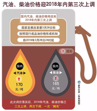 自3月28日24时起,国内汽油、柴油价格每吨分别提高170元和165元。
