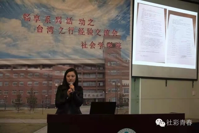畅享系列活动,顾名思义,旨在为同学们在学习方面创造一个分享和交流的平台。本次活动的主要内容是邀请社会工作专业2015级研究生杜依桥同学对她为期四个月的台湾专业学习交流之行与同学们进行一次分享。首先,她给大家列出了去台湾交流学习必要的四个条件,即:品学兼优、思想积极向上、独立自主、家人支持。并着重强调了一个人远赴台湾学习生活意味着要自己应对许多事情,这与有一个强大的独立自主能力是息息相关的。