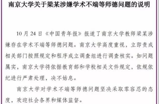 15.10月23日,有媒体报道南京大学教师梁某涉嫌存在学术不端等师德问题,南大昨日回应,立即成立调查组调查,如问题属实,绝不姑息。