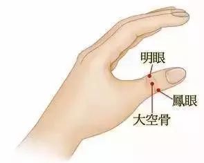 这组穴位分别位于拇指关节的两侧及中间处。明眼穴和凤眼穴可改善急性结膜炎,还可以抑制老人性的白内障;大空骨可改善一切有关眼睛的症状。