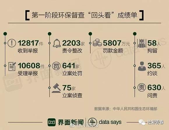 日前,生态环境部发布第一阶段环保督查“回头看”成绩单。截至6月15日,6个督察组收到群众举报12817件,受理有效举报10608件;各被督地区已完成查处3206件,其中立案处罚641家,罚款5807万元;约谈365人,问责630人。