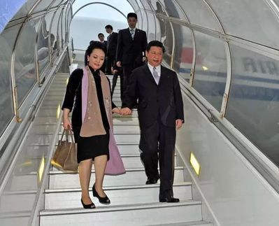 2013年3月26日,习近平抵达南非德班时和彭丽媛牵手走下飞机。