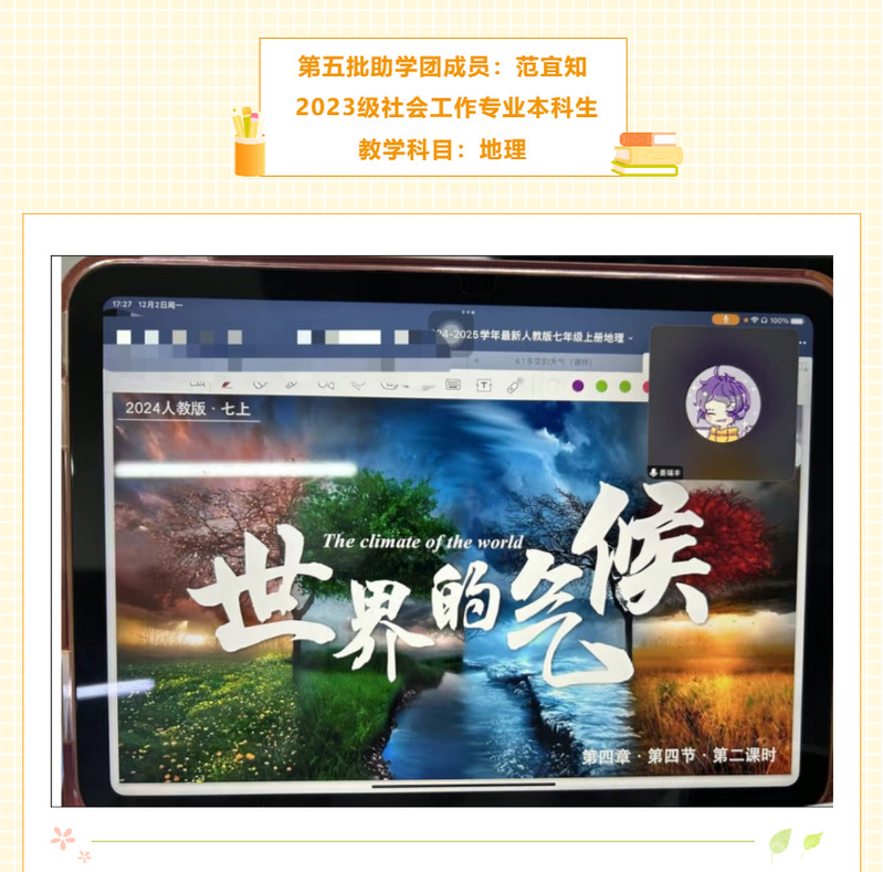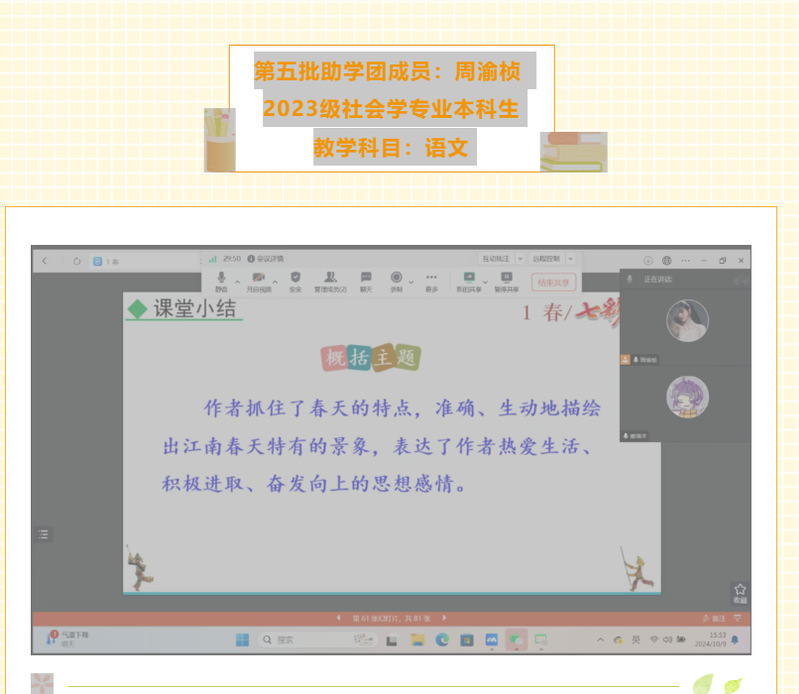 感悟:作为他的云端语文老师,我未曾想过这场跨越千里的相遇,会让我在方寸屏幕间重新理解教育的意义。当我们第一次通过腾讯会议开启我们的第一课的时候,围绕我们的不是局促、不是尴尬,而是充满热情的彼此。他会用昂扬的语气回答我的每一个问题,他会用质朴的笑容回复我的询问,他会在每节课的课前课后说上一句老师好!”“老师再见,他会在受到我表扬时回复我一个腼腆的笑容。半年的陪伴,一学期的教学,教会我教育的本质是生命的相互照亮。那些闪烁的像素点里,藏着一个孩子对世界的全部温柔想象。感谢小丰,让我这位老师21岁的春天领悟:最好的课堂,从来都生长在真诚对话的土壤里;最动人的成长,永远是师生共赴的星光旅程。